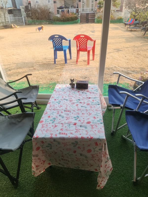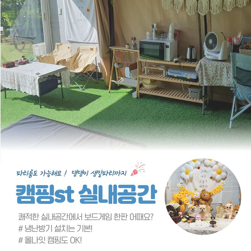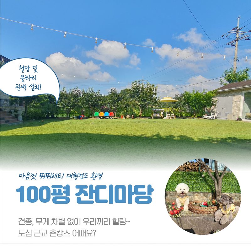 냉난방 실내공간, 주차시설, 화장실, 냉난방기, 냉장고, 커피포트, 생수제공, 블루투스 스피커, 잔디제거용 강아지 드라이기, 울타리 완벽 설치, 배달 및 포장 가능 |
