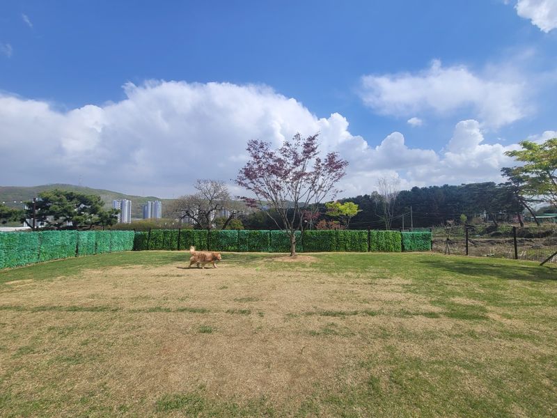 소형견, 중형견, 대형견 모두 입장가능하며 리드줄, 입마개 없이 뛰어놀수 있는 400평 마당입니다.