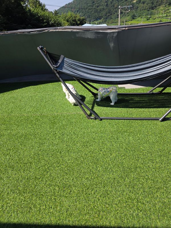 잔디 관리도 잘되어있고, 다른 마당에는 없는, 옥상도 있어서 좋았어요!! 마당은 천연잔디, 옥상에도 인조잔디가 깔려있어서 강아지들이 실컷 뛰뛰했네요. 사장님도 친절하시고, 시간 너무 빨리 가서 아쉬웠어요. 곧 시원해지면 바비큐도 이용할게요ㅎㅎ