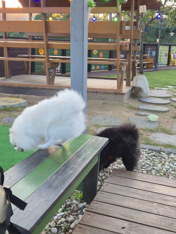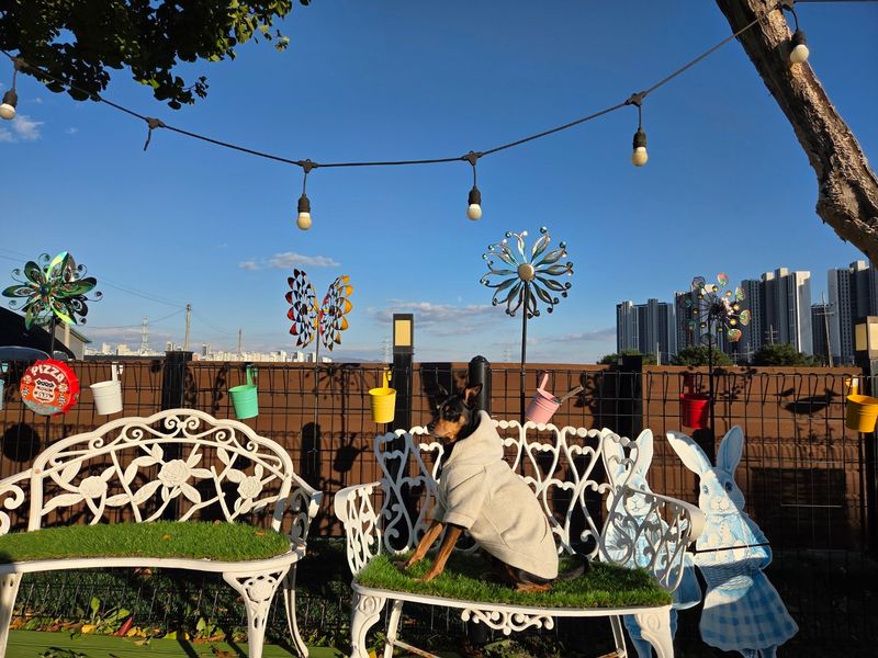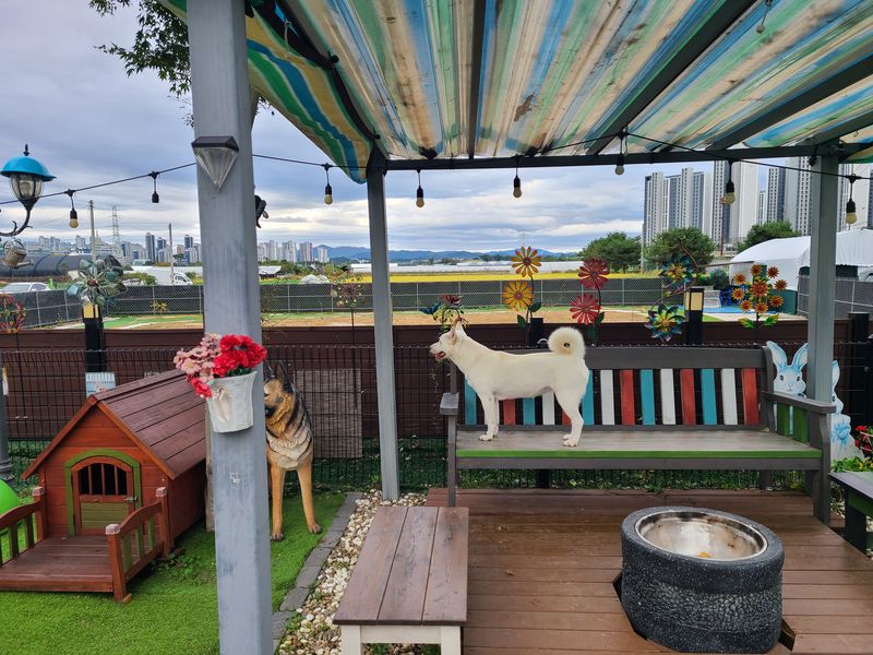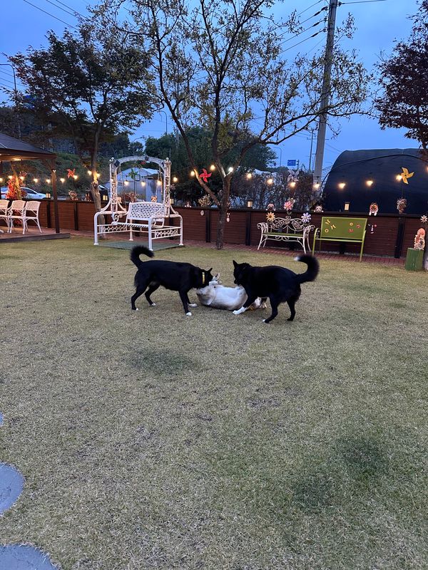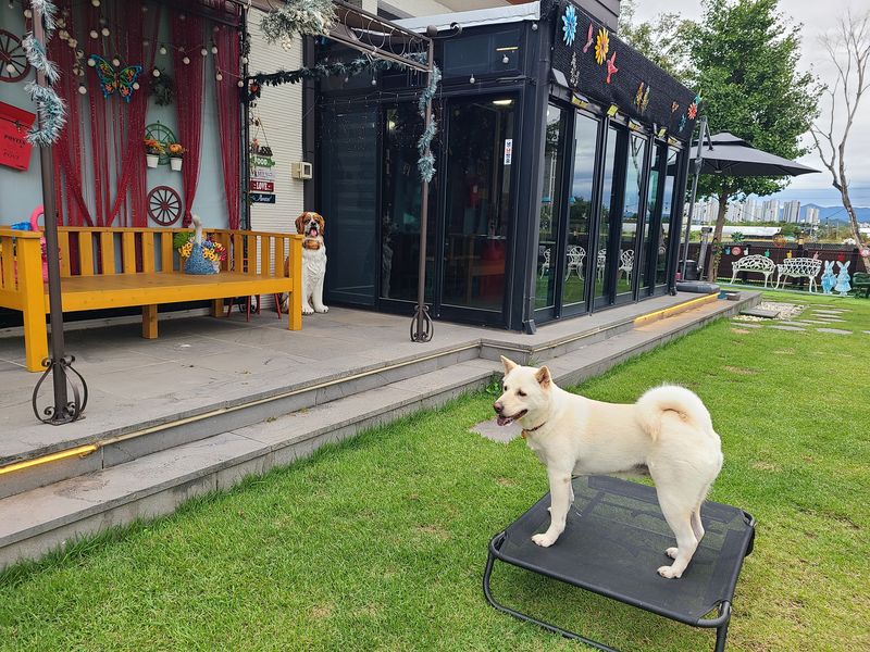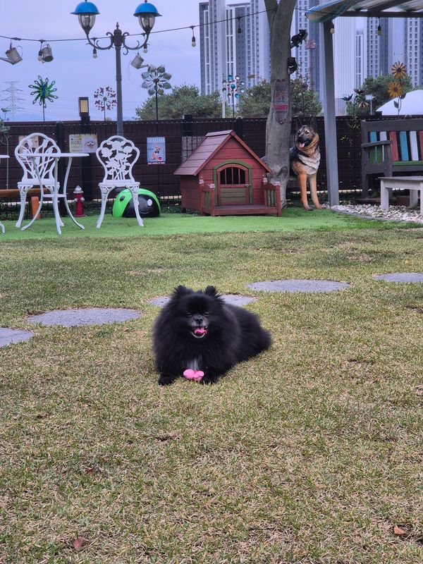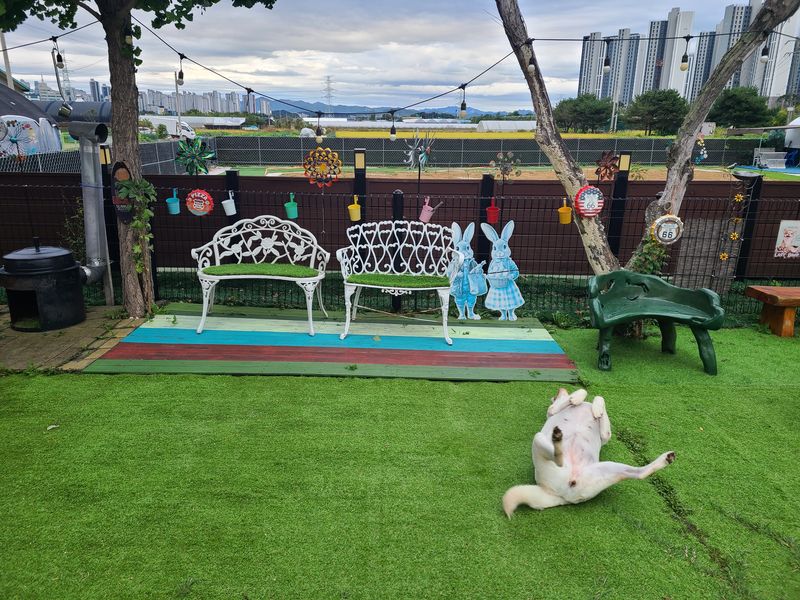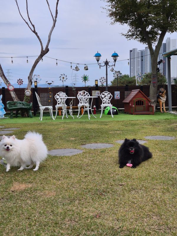 오랜만에 방문했는데 아기자기하게 더 꾸며놓으셨어요 천연 잔디라 댕댕이들이 뛰뛰하기도 넘 좋아요 개딸내미들 신나게 잘 놀다 왔어요~ 사장님의 서프라이즈 선물도 넘 감사했어용