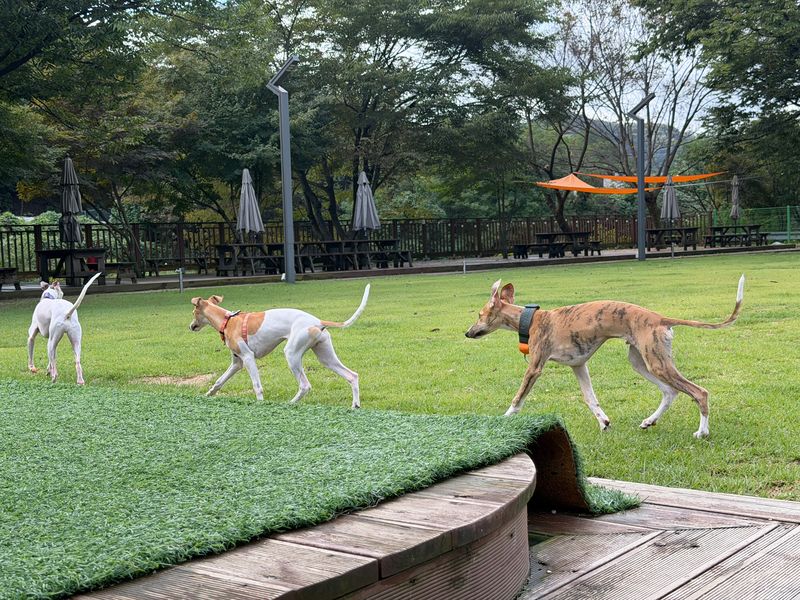 비가와서 걱정했는데 다행히 그처서 뛰뛰하고왓어요ㅋ 사장님이 넘 친절하세요 비오면 환불해준다고 먼저 말씀도 해주시고 라면 물 각종 물건이 다 배치되있네요 펜션수준에 감동! 소중대형견까지 남 눈치안보고 자유롭게 놀수있어서 완전만족요 운동장가면 규제가많아서 이렇게 맘편히 놀고오니 다음에도 계속이용계획요ㅋㅋㅋ꽤 넓은편이라 하운드아가들 3시간 열심히 뛰튀하고왔어요
