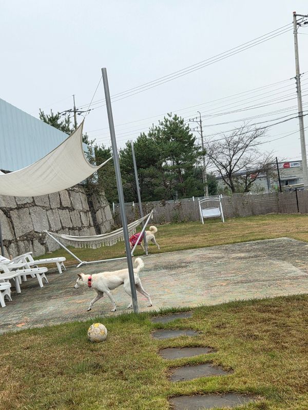 작년에 다녀오고 넘 좋은 시간 보낸 기억에 다시 예약하고 방문했습니다. 저희 강아지가 다른 강아지 친구들을 안좋아해서 일부러 단독 마당을 빌리는데 잔디밭 넓고, 애기도 좋아하고, 고기 구워먹고 놀기도 편해서 다시 방문했습니다. 계속 비가 와서 걱정했는데 다행히 방문한 날은 쨍쨍해서 잘 놀고왔습니다! 자물쇠 거는 이벤트도 있고 사장님도 엄청 친절하세요~^^ 담에 또 놀러 갈게요~~